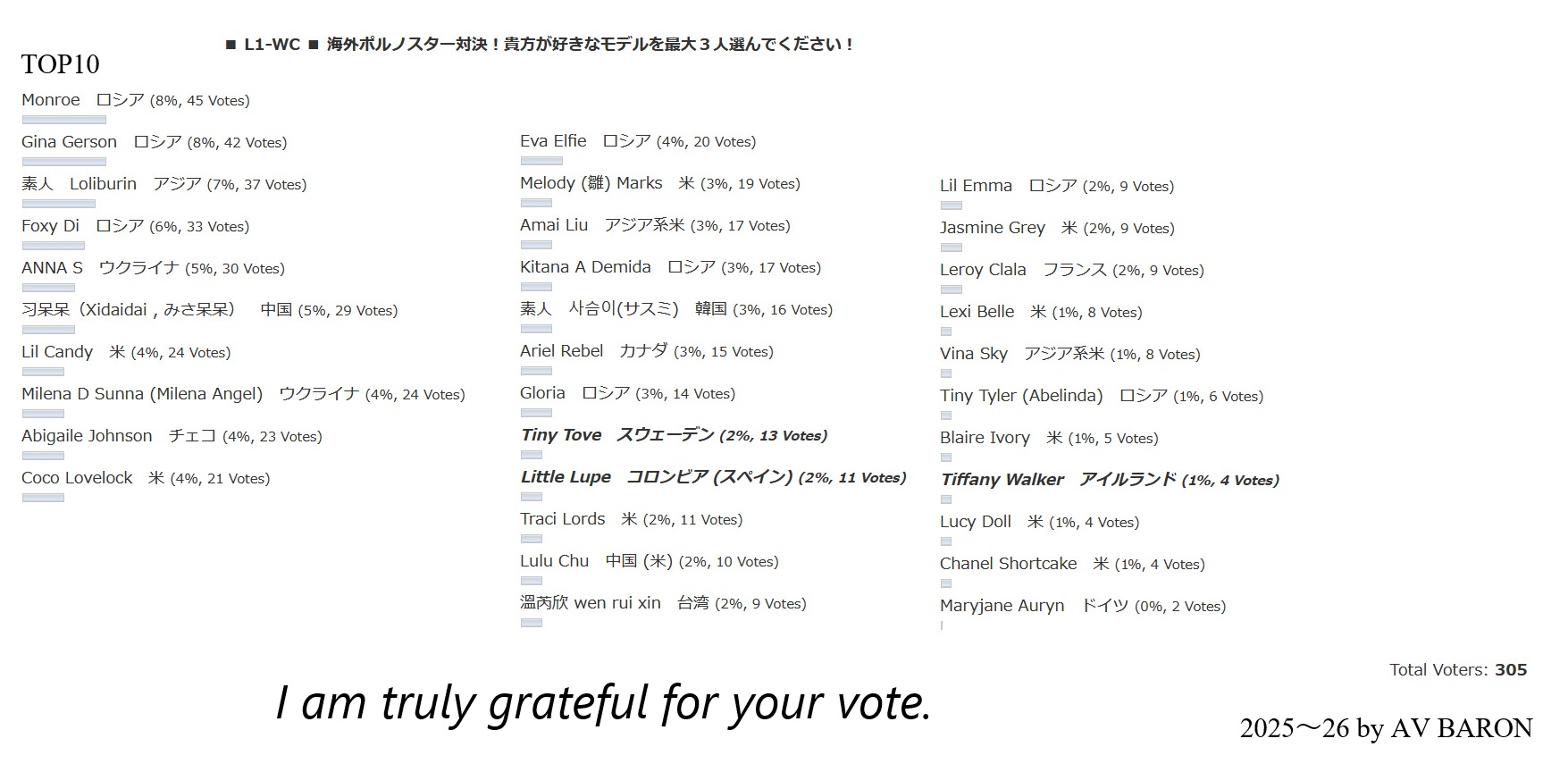 投票は不要につき、それでいいと思います。Monroeは予想通りでしたがLil Candyが7位とは