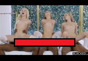 海外 これは絶景!金髪&貧乳の女三人、横並びで騎乗位で黒人棒ガン突き!